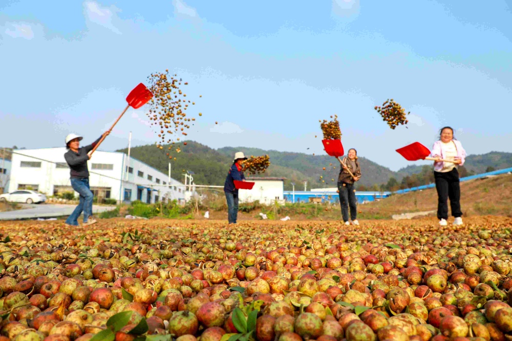 初冬時節(jié),貴州省黔東南苗族侗族自治州從江縣種植的油茶果迎來全面收獲期,村民們搶抓晴好天氣晾曬油茶果,鄉(xiāng)村呈現(xiàn)一派繁忙景象。11月12日,貴州省從江縣丙梅街道居民在晾曬油茶果(無人機(jī)照片)。目前,該縣油茶種植面積累計達(dá)17.16萬畝,掛果面積8.23萬畝,今年預(yù)計產(chǎn)茶籽產(chǎn)量約8200噸,產(chǎn)值約1.2億元。